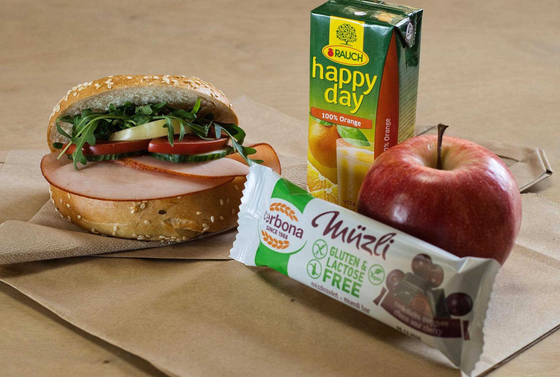 Egyéni csomagolású útravaló: 1 db bagel szendvics, 1 db gyümölcs (alma vagy banán), 1 db müzliszelet és 1 db gyümölcslé.