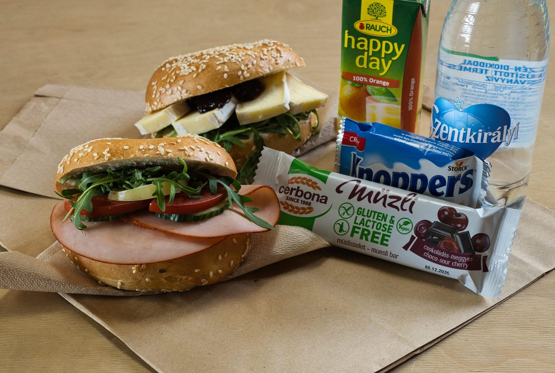 Egyéni csomagolású útravaló: 2 db bagel szendvics, 1 db müzliszelet, 1 db Knoppers szelet, 1 db gyümölcslé és 0,5 l ásványvíz