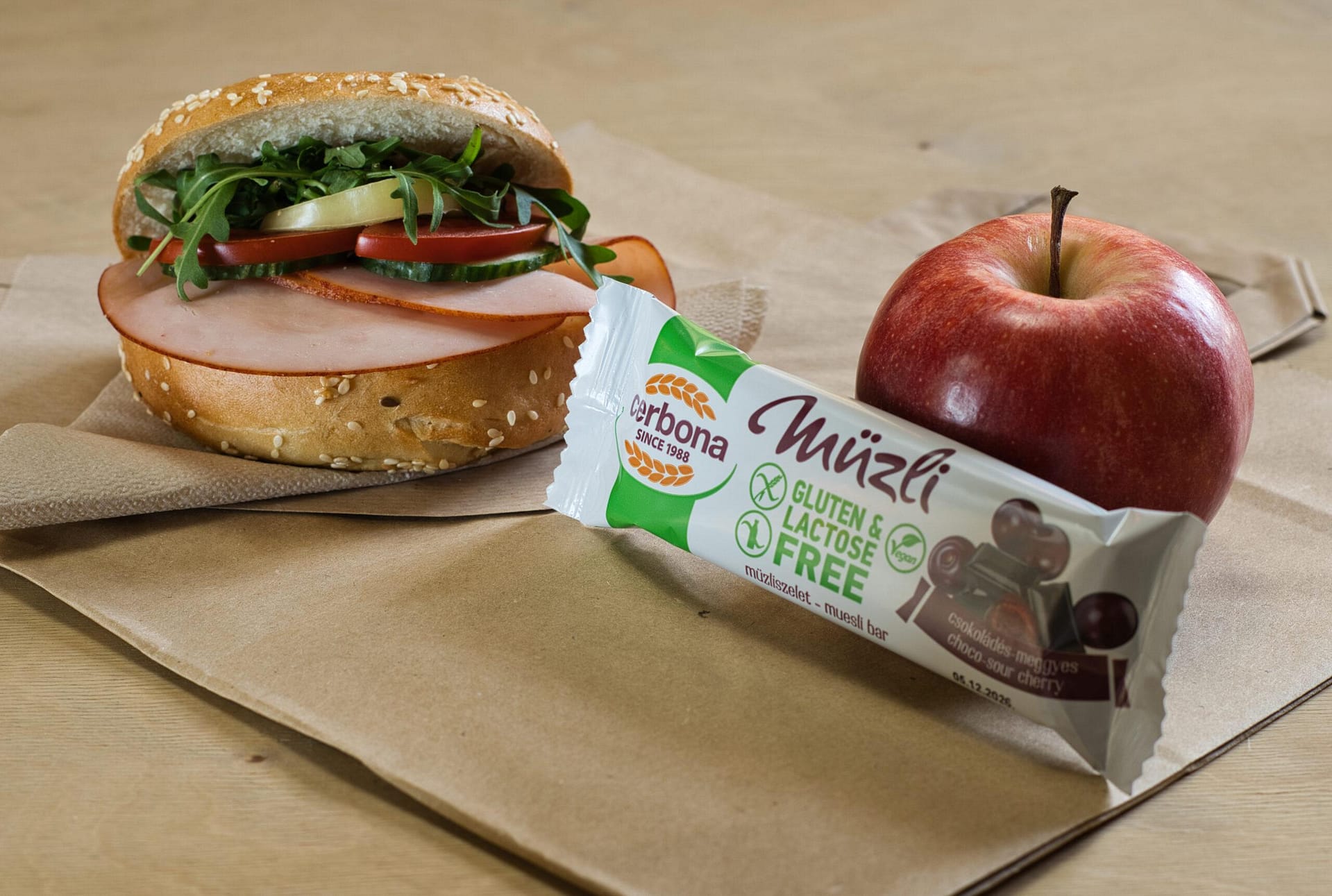 Egyéni csomagolású útravaló: 1 db bagel szendvics, 1 db gyümölcs (alma vagy banán) és 1 db müzliszelet.