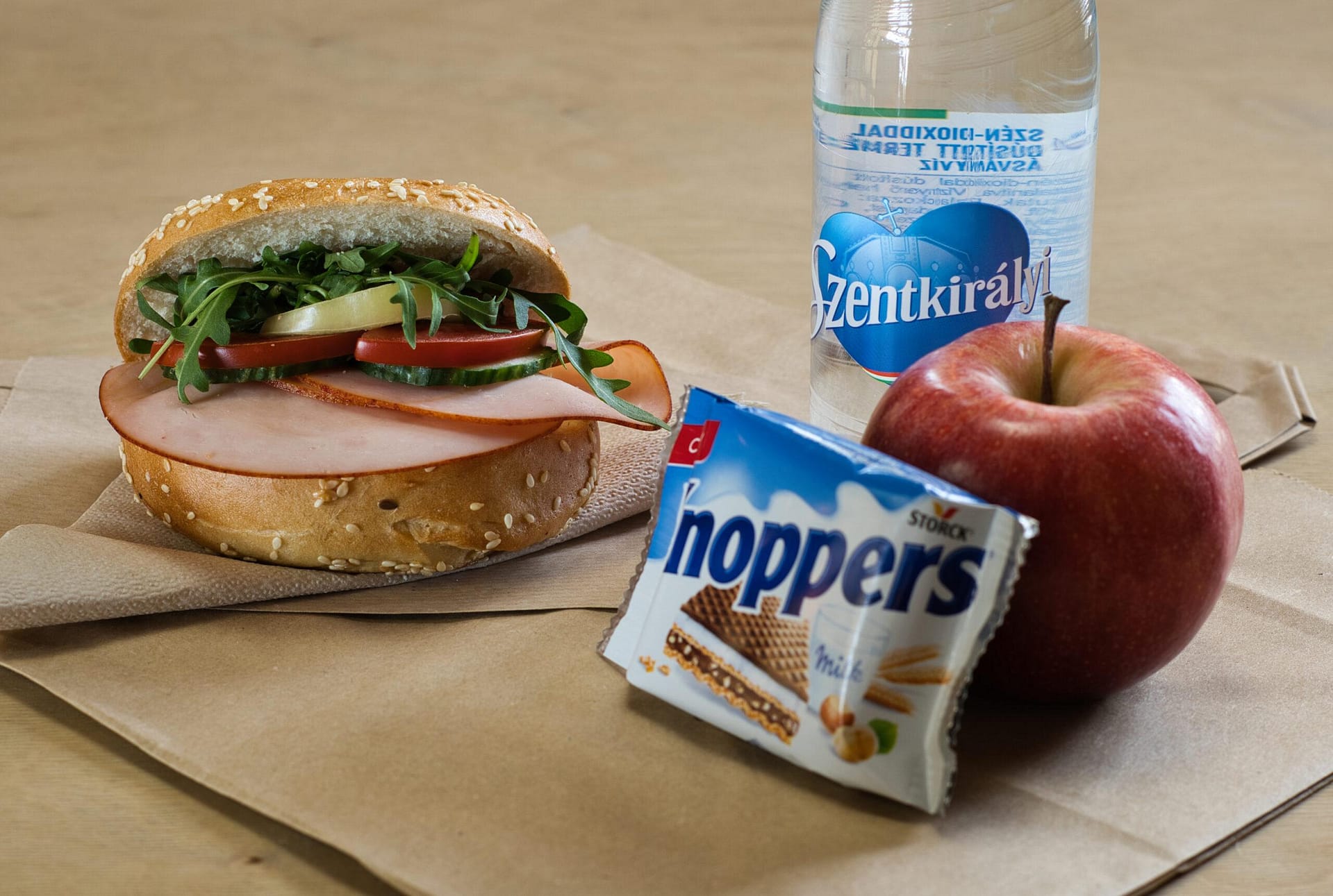Egyéni csomagolású útravaló: 1 db bagel szendvics, 1 db gyümölcs (alma vagy banán), 1 db Knoppers szelet és 0,5 l ásványvíz